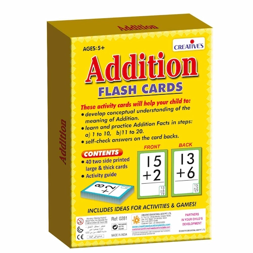 ‘Addition – Flash Card’ is a Two side printed large & Thick . where front of each card Children Add number and matching with the answers printed on the back of each card.