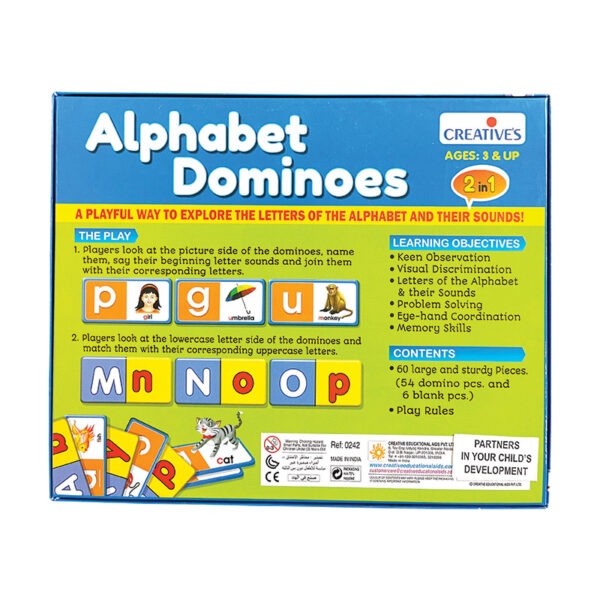 “Alphabet Dominoes 2 in 1” comprises 60 (54 domino pieces and 6 blank pieces) large and sturdy pieces along with play rules. The game can be played in two different ways. Set 1 contains 27 Domino Cards and aims at reinforcing phonemic skills in children. Each domino card is divided into two halves, making two squares. One of the squares has a picture and the other has a letter of the Alphabet. Players look at the picture side of a dominoes, name it, say its beginning letter sounds, find another dominoes with corresponding letter and join them together. Set 2 has been designed to strengthen recognition of both forms of letters of alphabet; capital (uppercase) and small (lowercase) and to sequence the letters in alphabetical order. Players look at the lowercase side of a dominoes, name it and match it with the corresponding uppercase letter on another dominoes in the alphabetical order.