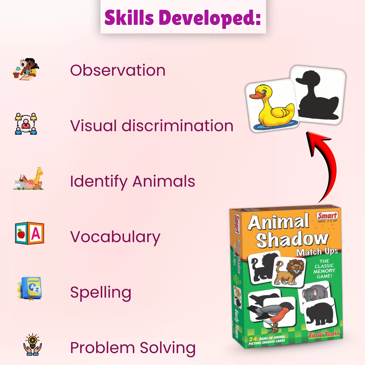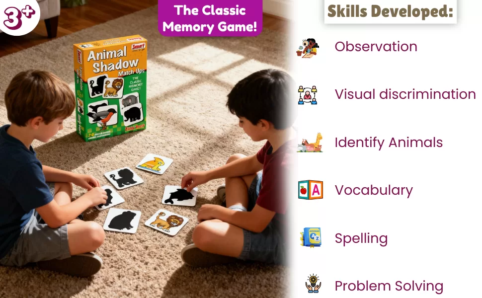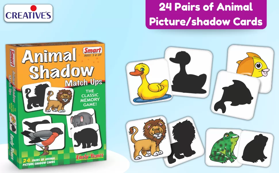 “ Animal Shadow Match Ups” is a Classic Memory game where a child needs to match animals and their shadows. The illustrations are simple and bold making it suitable for the children of ages 3 years and above.