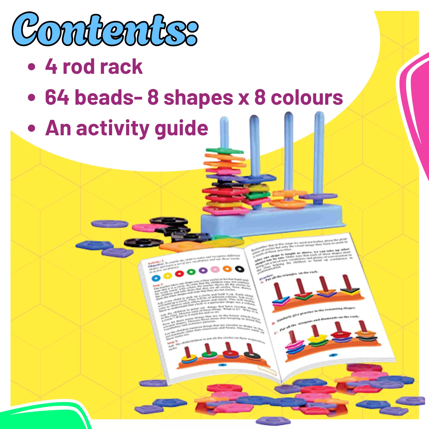 It has a plastic abacus stand and 64 beads of 8 important shapes