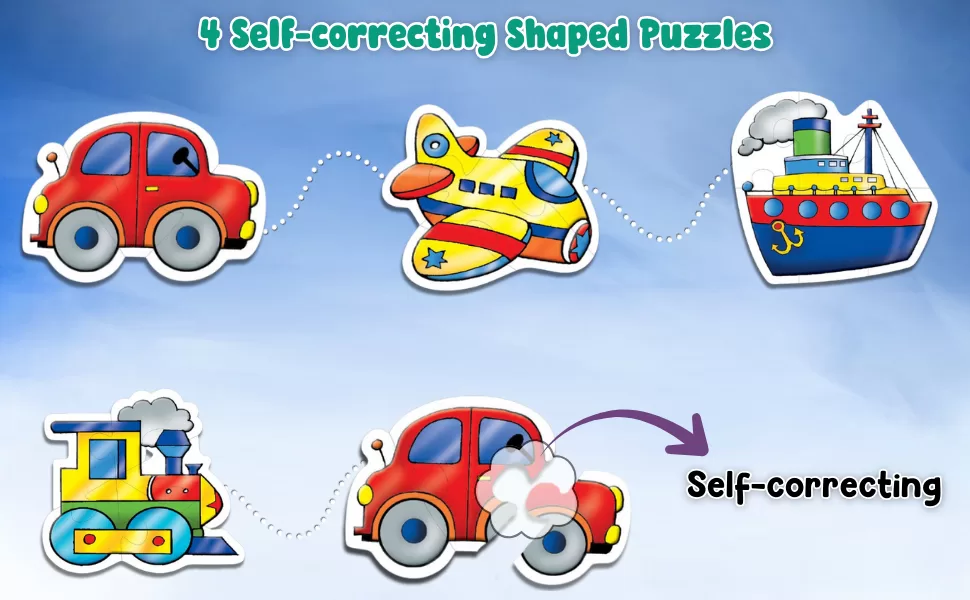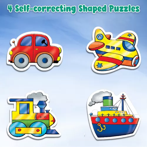 shaped puzzles car, aeroplane, train, and ship graded from 3 to 6