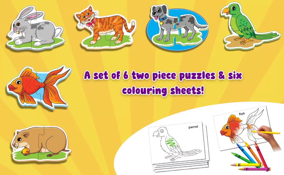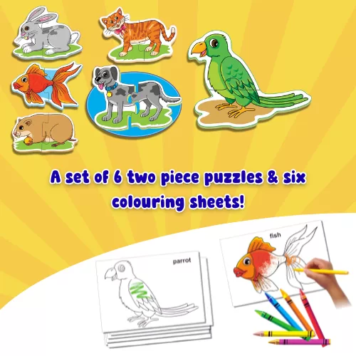 The set includes 6 shaped two-piece puzzles along with 6 colouring
