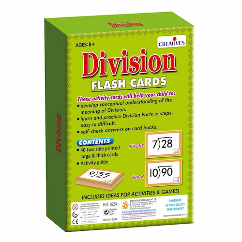 ‘Division – Flash Card’ is a Two side printed large & Thick . where front of each card Children Divide number and matching with the answers printed on the back of each card.