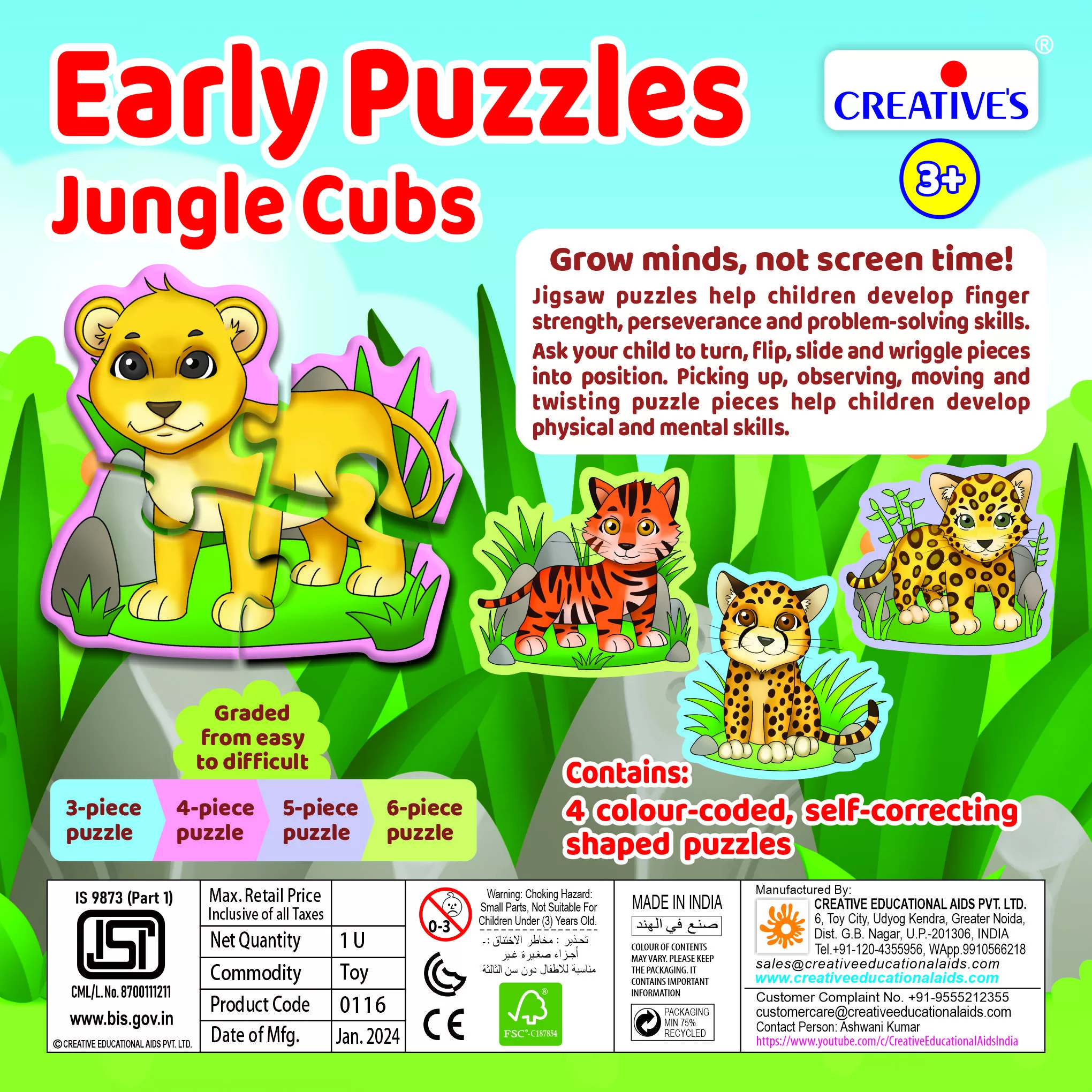 Early Puzzles – Jungle Cubs is a thoughtfully designed puzzle set for young children that combines learning with fun through hands-on play. The set includes 4 colourful, shaped puzzles featuring adorable jungle cubs like lions, tigers, and cheetahs.