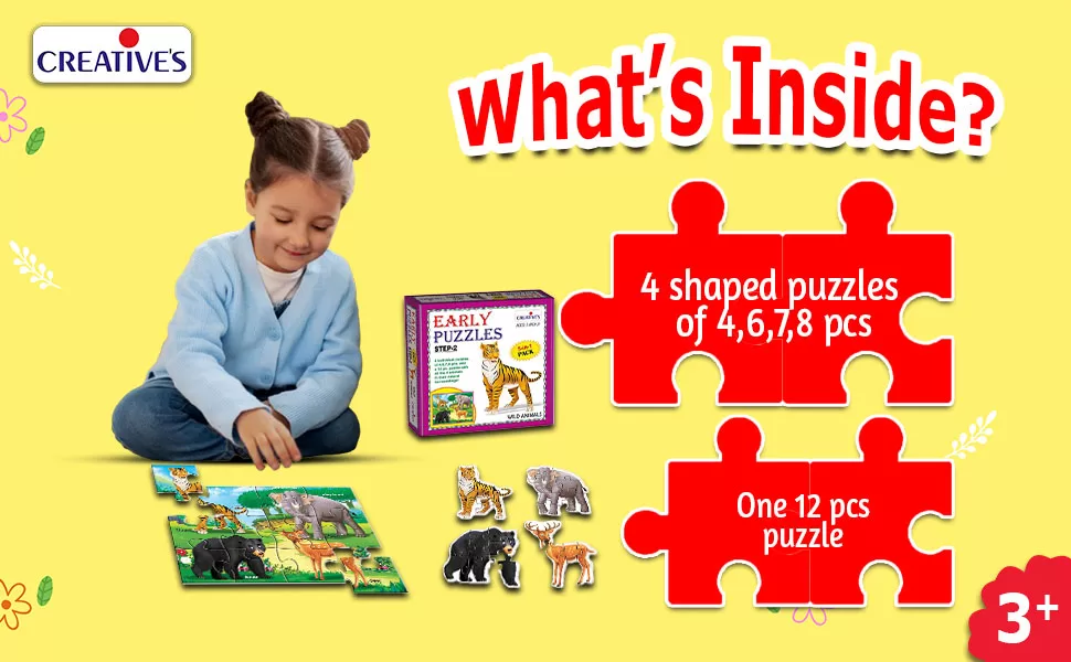 4 Shaped Puzzles (4, 6, 7, 8 pcs) + 1 Jungle Scene Puzzle (12 pcs)