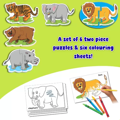 The set contains 6 shaped two-piece puzzles along with 6 colouring sheets,