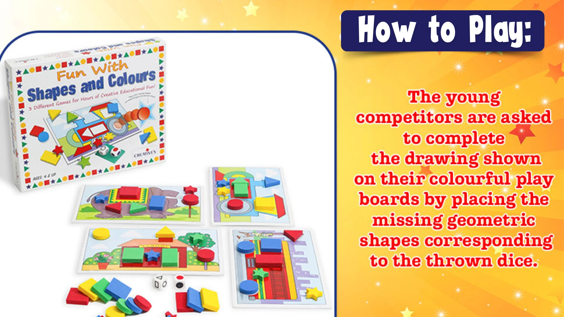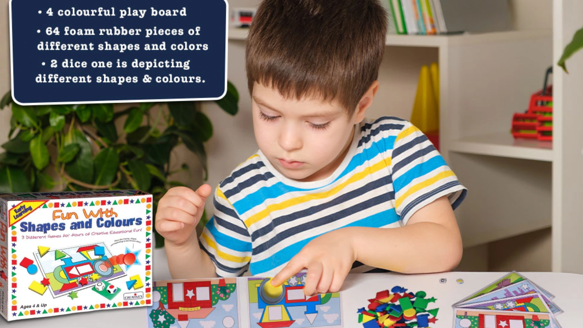 This set includes colourful play boards, foam shapes, and dice that together