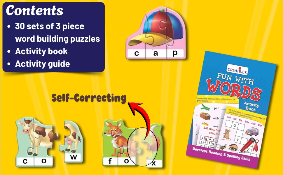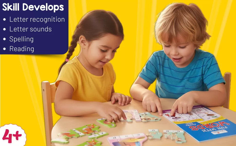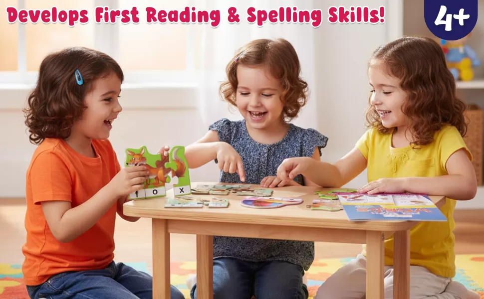 The set includes 30 self-correcting word building puzzles that combine pictures with letters, helping children recognise letters, understand sounds and build simple words while learning through play.