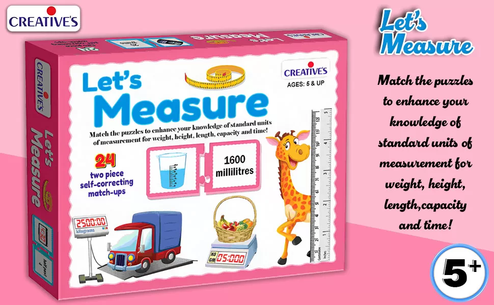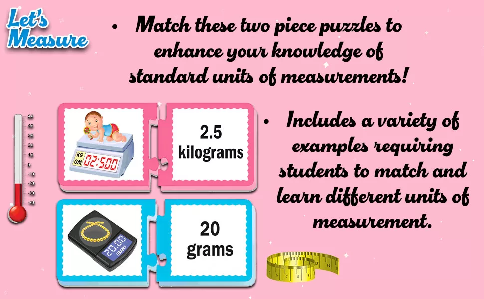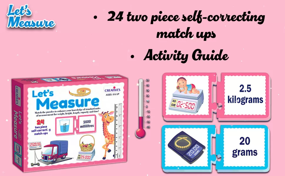 “Let’s Measure” introduces children to standard units of measurement to measure weight, length, time, temperature and volume with 24 two piece self- correcting match ups.