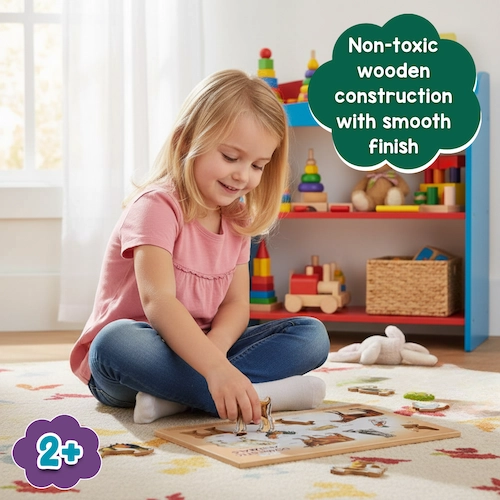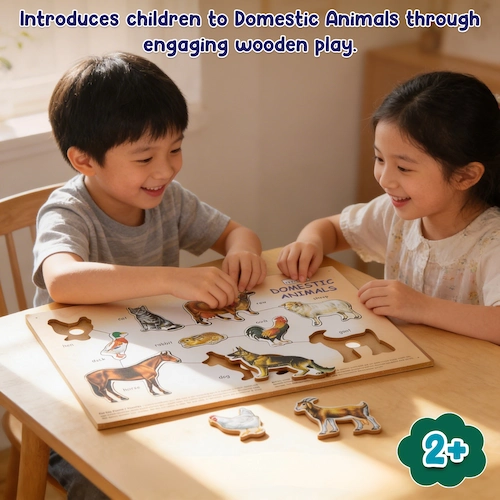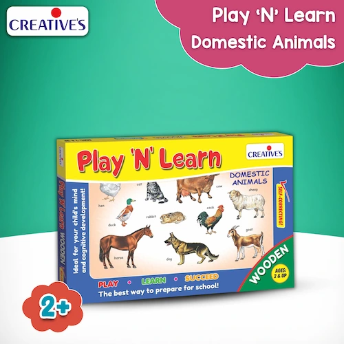 Play N Learn Domestic Animals is a wooden educational puzzle that helps children aged 2+ learn animal names while developing memory and motor skills.