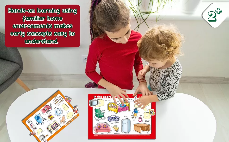 The familiar kitchen and bedroom themes make learning meaningful