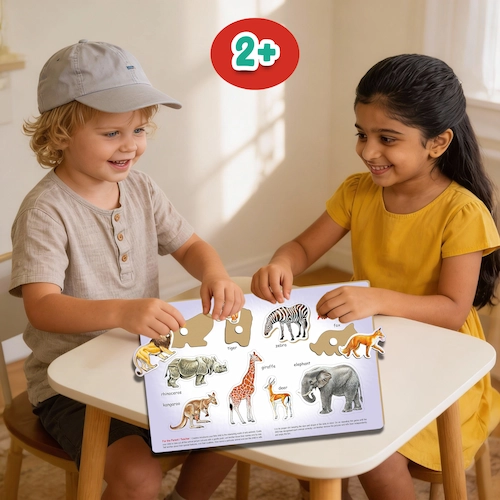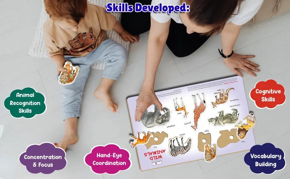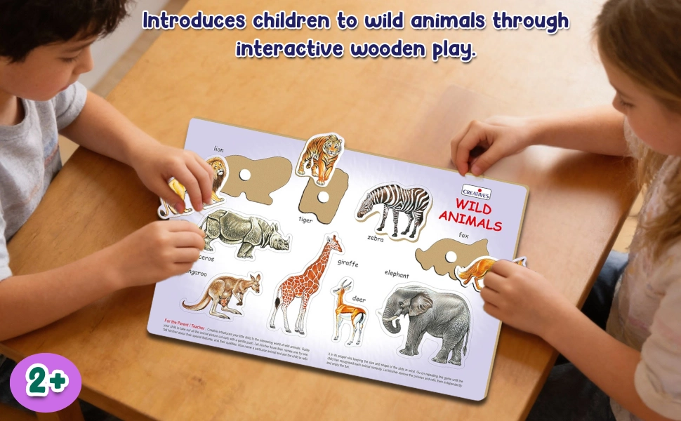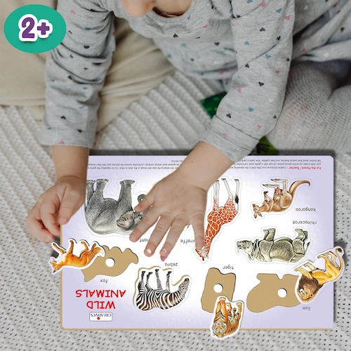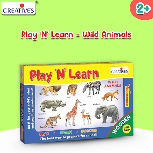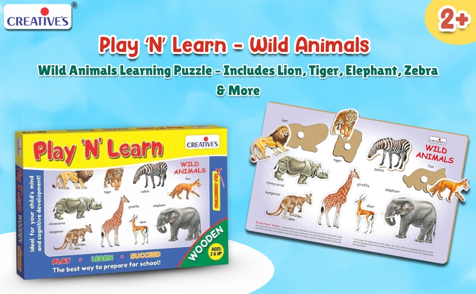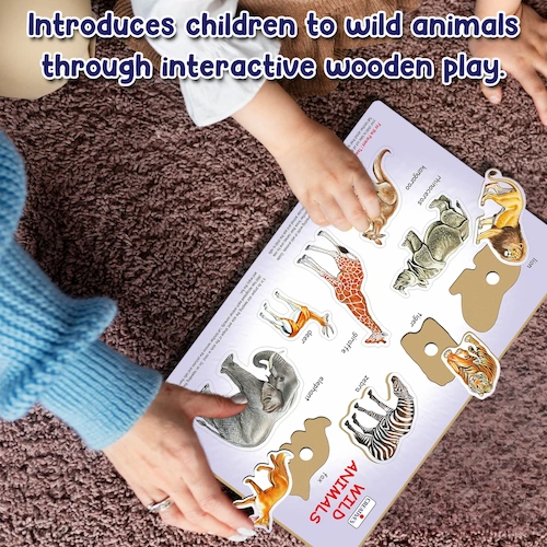 Play N Learn Wild Animals is a wooden educational puzzle that helps children aged 2+ learn animal names while developing memory and motor skills.
